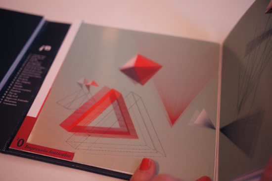 Presença + Percepção = Impressão is the result of the graduation project from college at Universidade Federal do Rio Grande do Sul (2011). It consists on a book with techniques applicable to print media, separated by topics such as motion, 3D structure, texture, or form module. Besides the physical representation of the technique (booklet on the right), the reader can understand how the technique is made through tutorials (booklet on the left).